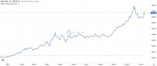 Hợp đồng vàng giao ngay tiến 2.3% lên 4,090.96 USD/oz, sau khi đạt mức cao nhất kể từ ngày 27/10 vào đầu phiên. Hợp đồng vàng tương lai cộng 2.2% lên 4,099.20 USD/oz.