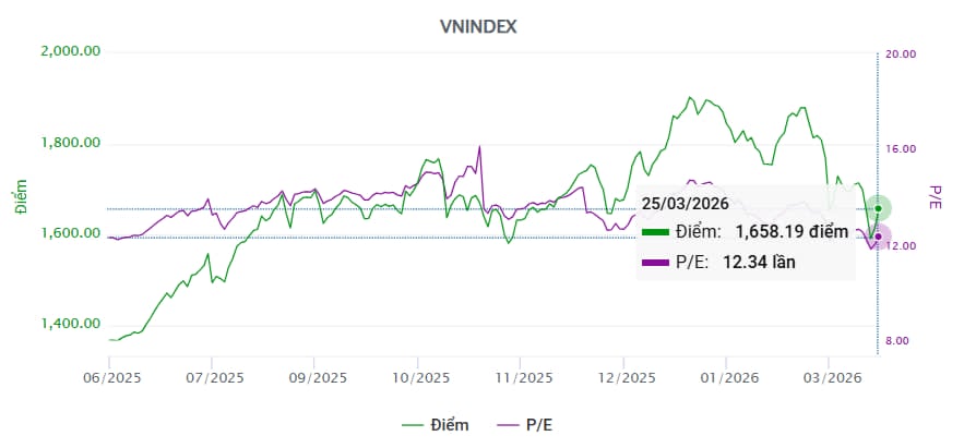 Trong bối cảnh đó, thị trường chứng khoán Việt Nam bắt đầu xuất hiện những yếu tố hỗ trợ. Nổi bật trong đó là định giá thị trường đã trở nên hấp dẫn hơn đáng kể sau đợt chiết khấu sâu, với P/E dự phóng chỉ khoảng 12.x lần cho năm 2026, nhiều cổ phiếu rơi vào trạng thái quá bán.