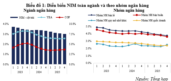 Năm 2025 đánh dấu giai đoạn tín dụng tiếp tục được thúc đẩy trong bối cảnh mặt bằng lãi suất duy trì ở mức thấp suốt thời gian dài. Nhờ đó, dư nợ toàn hệ thống ngân hàng mở rộng nhanh, góp phần duy trì nhịp độ cho hoạt động sản xuất – kinh doanh của nền kinh tế. Tuy nhiên, việc giữ lãi suất ở mức thấp khiến biên lãi ròng (NIM) của các ngân hàng tiếp tục chịu áp lực thu hẹp, phản ánh sự giằng co ngày càng rõ nét giữa hiệu suất của các tài sản sinh lãi (YEA) và chi phí huy động vốn (COF).