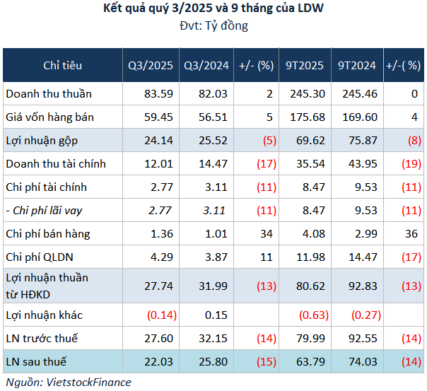 Theo báo cáo tài chính, doanh thu thuần quý 3 đạt gần 84 tỷ đồng, tăng nhẹ 2% so với cùng kỳ. Tuy nhiên, giá vốn tăng nhanh hơn doanh thu khiến lãi gộp giảm 5%, còn 24 tỷ đồng. Doanh thu tài chính giảm 17%, trong khi chi phí bán hàng và quản lý tăng lần lượt 34% và 11%, kéo lợi nhuận ròng giảm còn 22 tỷ đồng.