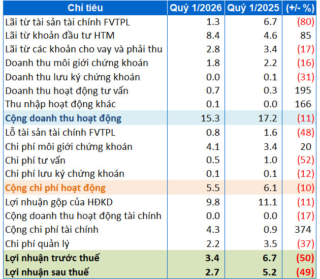 Quý 1/2026, APSC ghi nhận doanh thu hoạt động 15.3 tỷ đồng, giảm 11% so với cùng kỳ, chủ yếu do sự suy giảm mạnh của tài sản tài chính. Cụ thể, lãi từ tài sản tài chính ghi nhận qua lãi/lỗ (FVTPL) giảm tới 80%, chỉ còn 1.3 tỷ đồng. Ngược lại, lãi từ các khoản đầu tư nắm giữ đến ngày đáo hạn (HTM) tăng 85%, đạt 8.4 tỷ đồng, qua đó trở thành nguồn đóng góp chính cho doanh thu trong kỳ.