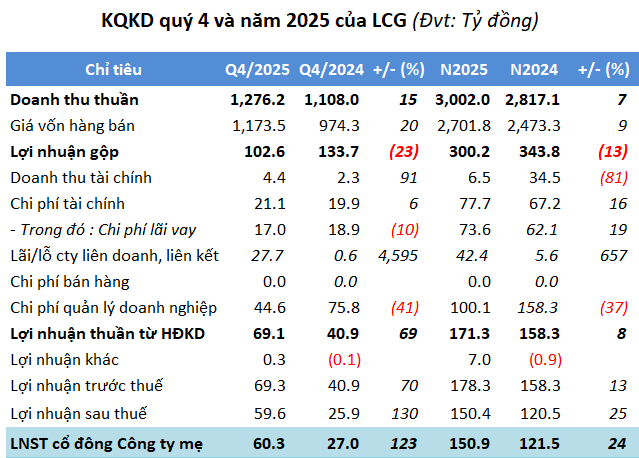 Động lực tăng trưởng đến từ mảng thi công hạ tầng giúp LCG ghi nhận lợi nhuận quý 4/2025 cao nhất trong 8 quý, đồng thời Doanh nghiệp thành lập pháp nhân để tham gia đấu thầu và thi công các dự án năng lượng tại Indonesia.