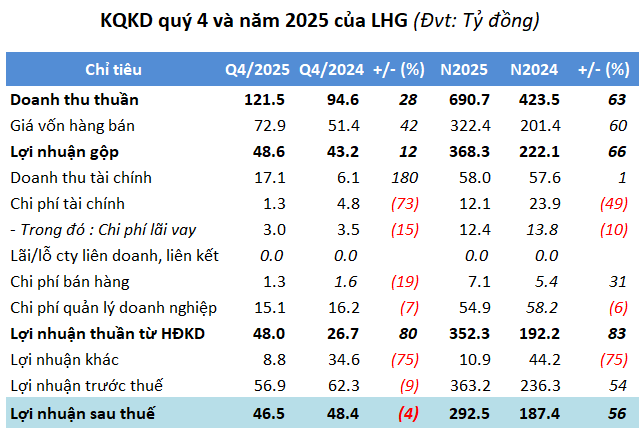 Dù doanh thu tăng trưởng trong quý cuối 2025, song áp lực giá vốn và sự sụt giảm của khoản lợi nhuận khác đã kéo lãi ròng LHG đi lùi. Dù vậy, Doanh nghiệp vẫn khép năm bằng mức lợi nhuận cao nhất trong 4 năm qua.