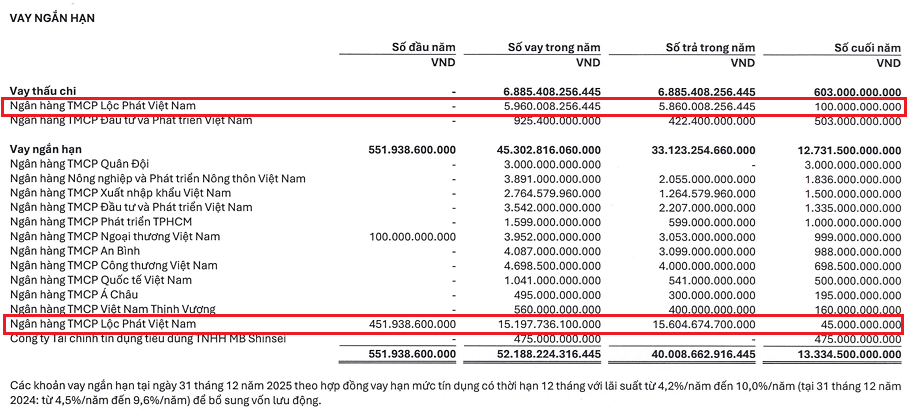 LPBS và LPBank là các đối tác quen thuộc. Trong năm 2025, LPBS vay cũng như trả thấu chi tại LPBank lên đến gần 6,000 tỷ đồng. Hoạt động vay ngắn hạn cũng sôi động khi quy mô vượt ngưỡng 15,000 tỷ đồng mỗi chiều.