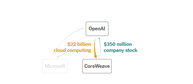 Qua ba thỏa thuận khác nhau được ký trong năm nay, OpenAI đồng ý trả cho CoreWeave, một công ty xây dựng trung tâm dữ liệu AI, hơn 22 tỷ USD cho sức mạnh điện toán. Trong khuôn khổ các thỏa thuận này, OpenAI nhận được 350 triệu USD cổ phiếu của CoreWeave, có thể giúp thanh toán cho sức mạnh điện toán này.