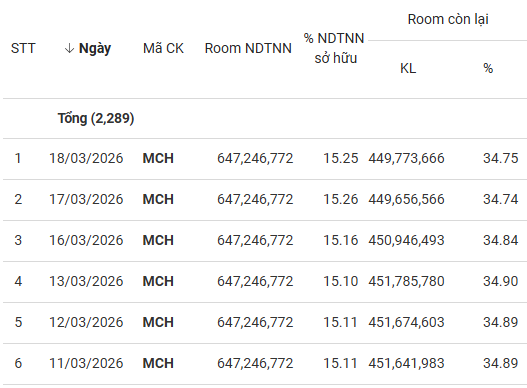 Tính đến ngày 18/03, cổ đông nước ngoài đang sở hữu 15.25% cổ phần MCH, tương đương hơn 657 triệu cp. MCH còn 34.75% room ngoại, tương đương 449 triệu cp. Hiện, Masan Consumer đang có 1 cổ đông lớn là Công ty TNHH Masan Consumer Holdings sở hữu 70.44% vốn, tương đương gần 741 triệu cp.
