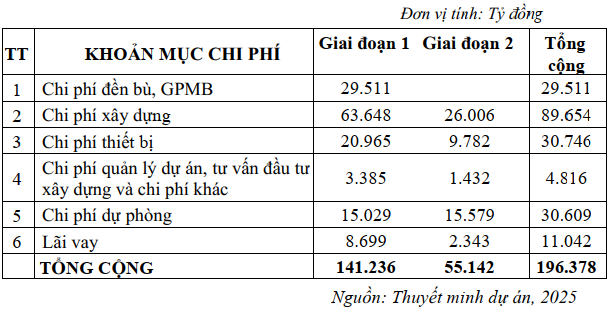 Tổng mức đầu tư 196,378 tỷ đồng, từ nguồn vốn nhà nước; trong đó chi phí đền bù và giải phóng mặt bằng hơn 29.5 ngàn tỷ đồng, lãi vay hơn 11 ngàn tỷ đồng, xây dựng gần 89.7 ngàn tỷ đồng, thiết bị trên 30.7 ngàn tỷ đồng…