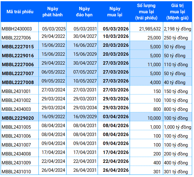 Thời gian mua lại các lô trái phiếu diễn ra liên tục từ ngày 10/03 tới 26/04/2026, theo các báo cáo do MB công bố tới ngày 20/03/2026 trên website chính thức của Ngân hàng.