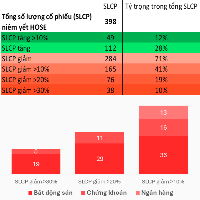 Ngành bất động sản, chứng khoán chiếm số lượng lớn trong nhóm cổ phiếu giảm trên 30%, trong khi cổ phiếu ngân hàng chủ yếu giảm từ 10-20% Đvt: cp