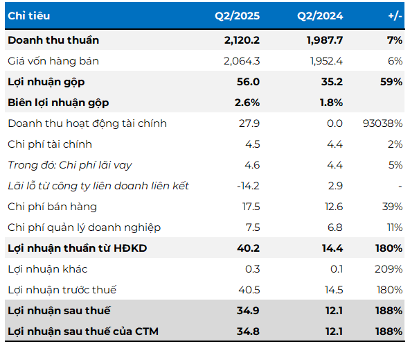Trong quý 2/2025, Công ty ghi nhận doanh thu thuần 2,120 tỷ đồng, tăng 7% so với cùng kỳ năm trước, chủ yếu đến từ việc mở rộng quy mô hoạt động kinh doanh. Đáng chú ý, lợi nhuận sau thuế đạt 35 tỷ đồng, tăng vọt 188%.