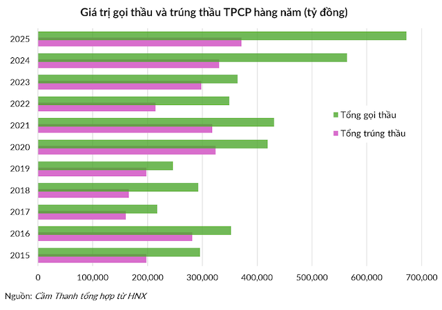 Giá trị phát hành năm 2025 tăng 12.4% so với năm trước và là mức cao nhất kể từ khi có số liệu so sánh vào năm 2012 tới nay. Tuy nhiên, kết quả phát hành này chỉ đạt 74.3% kế hoạch đặt ra đầu năm.