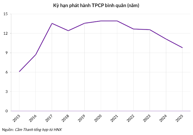 Trong 5 năm qua, kỳ hạn trung bình TPCP phát hành hàng năm giảm dần từ 13.9 năm vào 2021 xuống còn 9.8 năm vào 2025, nhưng vẫn đảm bảo trên ngưỡng 9 năm mà Quốc hội đề ra.