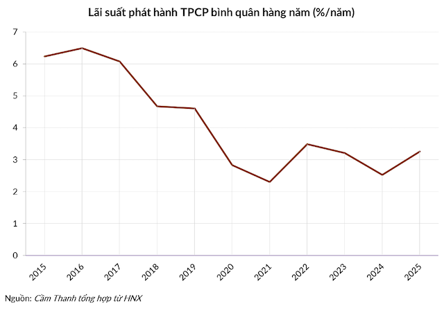 Lãi suất phát hành bình quân TPCP trong năm 2025 là 3.26%/năm. Mức lãi suất cụ thể tăng dần từ 2.68% của kỳ hạn ngắn 5 năm lên 3.36% ở kỳ hạn dài 30 năm.