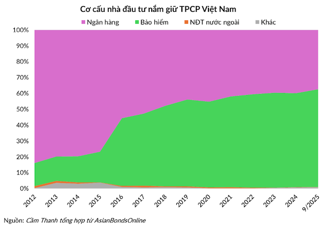 Các ngân hàng thương mại trong nước và ngành bảo hiểm hiện đang nắm giữ hơn 99% tổng lượng TPCP lưu hành. Bảo hiểm Xã hội Việt Nam (BHXH) là nhà đầu tư lớn nhất trên thị trường TPCP. Theo quy định, BHXH chỉ được phép đầu tư vào một danh mục hạn chế, trong đó ưu tiên hàng đầu là TPCP.
