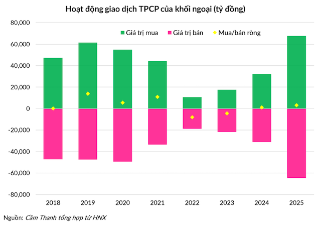 Cụ thể với cổ phiếu ở cả HOSE, HNX và UPCoM, khối ngoại mua vào gần 715 ngàn tỷ và bán ra gần 836 ngàn tỷ, tức bán ròng 121 ngàn tỷ đồng trong năm 2025.