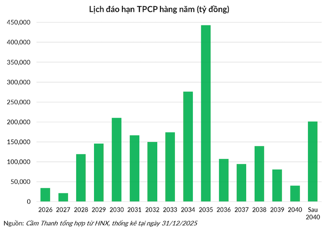 Giai đoạn tới, 2035 sẽ là năm có giá trị TPCP đến hạn lớn nhất với 442.8 ngàn tỷ đồng, phần lớn số này đến từ 314 ngàn tỷ đồng TPCP kỳ hạn 10 năm vừa được phát hành trong năm 2025. Năm 2034 đứng thứ hai về giá trị TPCP đến hạn với 276.4 ngàn tỷ, chủ yếu do năm 2024 KBNN đã phát hành 197.6 ngàn tỷ đồng TPCP kỳ hạn 10 năm.