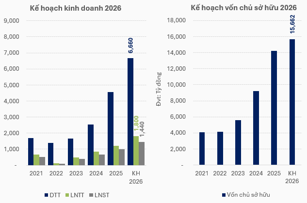 Cụ thể, ACBS dự kiến doanh thu đạt 6,660 tỷ đồng và lãi trước thuế 1,800 tỷ đồng và lãi sau thuế 1,440 tỷ đồng, lần lượt tăng 46%, 48% và 46% so với các con số thực hiện năm 2025 (BCTC riêng). Kế hoạch cho thấy Công ty muốn duy trì biên lãi sau thuế ổn định ở mức 21.6%.