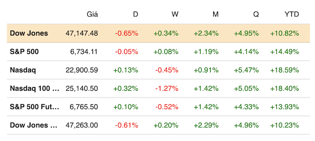 Kết thúc phiên giao dịch ngày 14/11, chỉ số Nasdaq Composite tiến 0.13% lên 22,900.59 điểm, chấm dứt chuỗi 3 phiên giảm liên tiếp. Chỉ số S&P 500 gần như đi ngang, chỉ hạ 0.05% xuống 6,734.11 điểm, còn chỉ số Dow Jones mất 309.74 điểm (tương đương 0.65%) còn 47,147.48 điểm. Cả 3 chỉ số chính đã phục hồi đáng kể so với mức đáy vào đầu phiên, khi Nasdaq Composite và S&P 500 lần lượt giảm 1.9% và 1.4%. Dow Jones đã sụt gần 600 điểm, tương đương 1.3%.