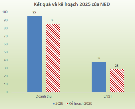 Với các quý trước thuận lợi, bức tranh kinh doanh cả năm của NED tỏ ra tươi sáng. Kết năm 2025, NED đạt doanh thu xấp xỉ 95 tỷ đồng và lãi ròng 38 tỷ đồng, tăng trưởng tương ứng 9% và 35%. Doanh nghiệp cũng vượt 11% mục tiêu doanh thu và gần 33% kế hoạch lãi sau thuế được ĐHĐCĐ thông qua.