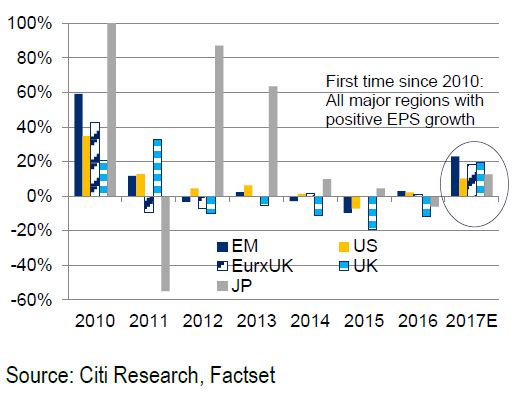 Robert Buckland, Trưởng bộ phận chiến lược cổ phiếu toàn cầu, cho biết: “Chúng tôi kỳ vọng tất cả các thị trường chủ chốt đều ghi nhận mức tăng trưởng EPS mạnh mẽ trong năm 2017. Đây là lần tăng trưởng đồng bộ đầu tiên kể từ năm 2010”.