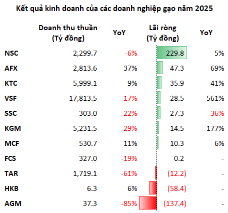 Sự điều chỉnh của thị trường quốc tế nhanh chóng lan sang bức tranh tài chính của nhóm doanh nghiệp niêm yết. Theo VietstockFinance, doanh thu của 11 doanh nghiệp gạo trên sàn năm 2025 đạt gần 37,081 tỷ đồng, giảm 17% so với năm 2024. Trái ngược với xu hướng này, lãi ròng toàn nhóm lại đảo chiều sang trạng thái dương, đạt gần 186 tỷ đồng, so với mức lỗ hơn 38 tỷ đồng của năm trước.