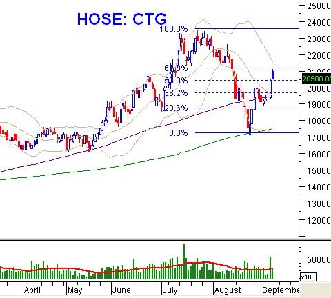 CTG đã test thành công vùng đáy cũ tháng 5/2015 (tương đương vùng 16,500-18,000) trong đợt điều chỉnh vừa qua. Đây là vùng có khối lượng tích lũy lớn nên độ tin cậy cao và rất khó phá vỡ.