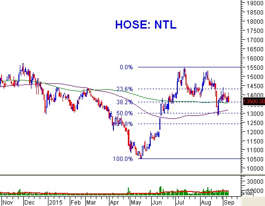 Tín hiệu kỹ thuật: NTL tăng khá mạnh từ tháng 5/2015 cho tới tháng 7/2015 và có thể đếm được 5 sóng tăng. Hiện tại, NTL chỉ đang trong giai đoạn điều chỉnh khi hành động giá trùng lắp (Overlapping Price Action).