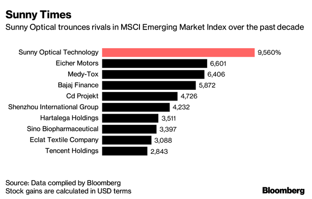 Sunny Optical được thành lập từ hơn 30 năm về trước bởi một người từng là nhân viên nhà máy sản xuất trang thiết bị, chỉ mới học hết trường trung học phổ thông và trong túi chỉ có gần 10,000 USD tiền vay mượn. Vậy mà nay, Sunny Optical đã là một đế chế trị giá 22 tỷ USD cung cấp ống kính (len) cho các công ty như Samsung và Xiaomi. Nhu cầu ngày càng tăng về camera trong những chiếc điện thoại thông minh, xe hơi và máy bay không người lái (drone) đã châm ngòi cho đà tăng trưởng lợi nhuận kéo dài hơn 1 thập kỷ của Sunny Optical, và nhờ đó cổ phiếu này cũng tăng chóng mặt.
