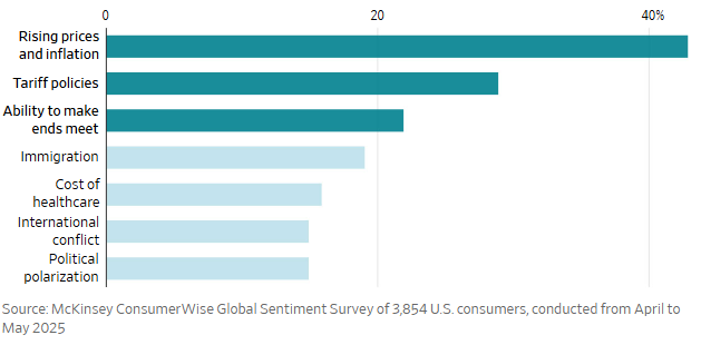 Cuộc thăm dò của McKinsey tháng 5 cho thấy hầu hết mọi người dự định điều chỉnh chi tiêu để đối phó với thuế quan. Giá cả tăng là mối lo hàng đầu, vượt xa các vấn đề như nhập cư, xung đột quốc tế hay phân cực chính trị.