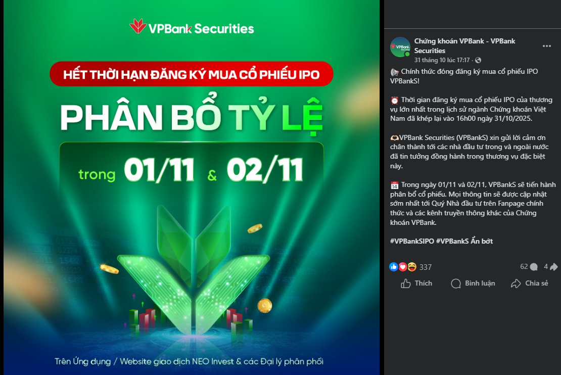 VPBankS thông báo tiến hành phân bổ tỷ lệ cổ phiếu cho nhà đầu tư tham gia đăng ký mua trong đợt IPO - Nguồn: Facebook VPBankS
