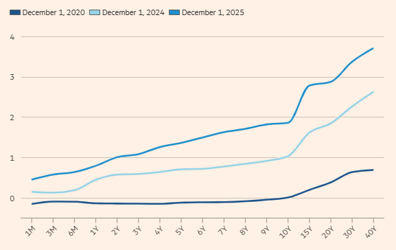 Với lạm phát nhiều khả năng đã ăn sâu vào nền kinh tế và BOJ liên tục phát tín hiệu nâng lãi suất, đường cong lợi suất trái phiếu Nhật Bản đã dốc lên đáng kể, cho thấy nhà đầu tư kỳ vọng rằng Nhật Bản sẽ tiếp tục duy trì lãi suất ở mức cao hơn. Trên hết, họ đang yêu cầu phần bù cao hơn cho quyết định giảm dần hoạt động mua trái phiếu của BOJ và các động thái nới lỏng chính sách tài khóa của Tân Thủ tướng Nhật Bản Sanae Takaichi.