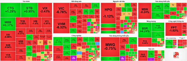 Ngành bất động sản tiếp tục gặp nhiều “sóng gió” khi đa phần các mã đều ghi nhận sắc đỏ và có đà giảm mạnh nhất thị trường với 4.53%. Cụ thể, VHM giảm 6.32%, VIC giảm 6.62%, VRE giảm 4.47%, CEO giảm 1.5% và NVL giảm 1.54%...
