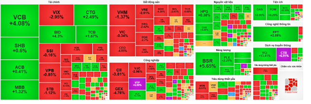 Ngoài ra, tuy diễn biến có phần phân hóa nhưng bên bán vẫn có phần chiếm ưu thế hơn ở nhóm tài chính giúp nhóm này duy trì đà tăng nhẹ. Trong đó, ở chiều mua có VCB tăng 3.92%, BID tăng 4.3%, CTG tăng 2.49%, TCB tăng 1.67%… riêng vẫn còn một số mã nhuộm sắc đỏ như VIX giảm 2.95%, TCX giảm 1.19%, STB giảm 1.12%, HDB giảm 1.56%...