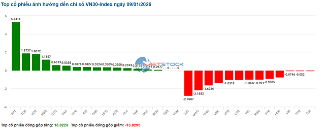 Các cổ phiếu trong rổ VN30 đang diễn biến với sắc xanh đỏ khá cân bằng. Cụ thể, FPT, TCB, VCB và MBB lần lượt góp 5.34 điểm, 1.87 điểm, 1.8 điểm và 1.18 điểm vào chỉ số chung. Trái lại, VJC, MWG, VHM và VRE đang chịu áp lực bán mạnh và lấy đi hơn 7.9 điểm từ VN30-Index.