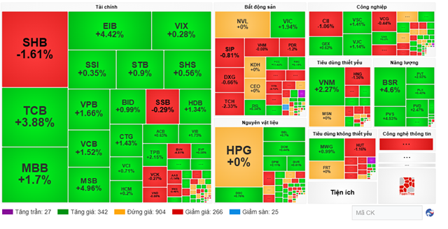 Ngành tài chính cũng diễn biến khá tích cực khi sắc xanh bao phủ hầu hết các cổ phiếu ngay từ khi mở cửa. Cụ thể, SHS tăng 2.22%, VIX tăng 2.22%, MBB tăng 1.13%, SSI tăng 1.04%, TCB tăng 1.62%...
