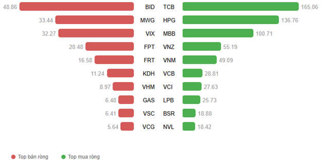 Khối ngoại mua ròng với giá trị 547.72 tỷ đồng trên cả ba sàn. Lực mua chủ yếu tập trung ở TCB và HPG với giá trị lần lượt là 165.06 tỷ và 136.76 tỷ. Trong khi đó, dẫn đầu top bán ròng là BID với giá trị chỉ 48.86 tỷ đồng.