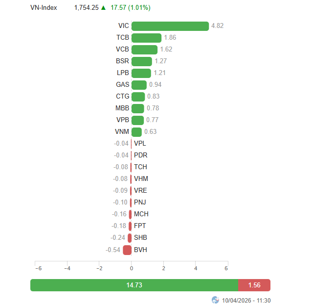 Trong top 10 cổ phiếu ảnh hưởng đến chỉ số VN-Index, VIC là mã có tác động tích cực nhất với đóng góp 4.82 điểm tăng. Theo sau là TCB, VCB, BSR và LPB cũng đem về tổng cộng gần 6 điểm cho chỉ số chung. Ở chiều ngược lại, tổng 10 mã có ảnh hưởng tiêu cực nhất chỉ lấy đi 1.56 điểm của chỉ số chung.