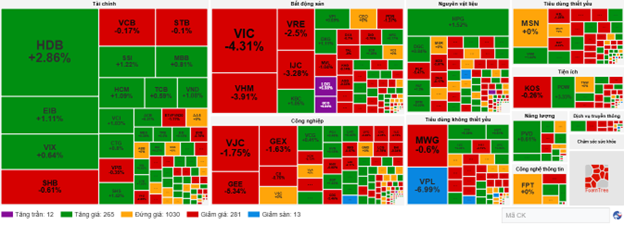 So với đầu phiên, bên bán tiếp tục chiếm ưu thế hơn. Số mã giảm là 281 mã và số mã tăng là 265 mã.