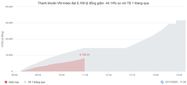 Thanh khoản thị trường vẫn trong trạng thái ảm đạm. Khối lượng giao dịch của HOSE sáng nay đạt gần 275 triệu đơn vị, tương đương với giá trị 8.1 ngàn tỷ, giảm 44.14% so với mức trung bình 1 tháng qua. HNX ghi nhận khối lượng hơn 22 triệu đơn vị, tương đương hơn 474 tỷ đồng.