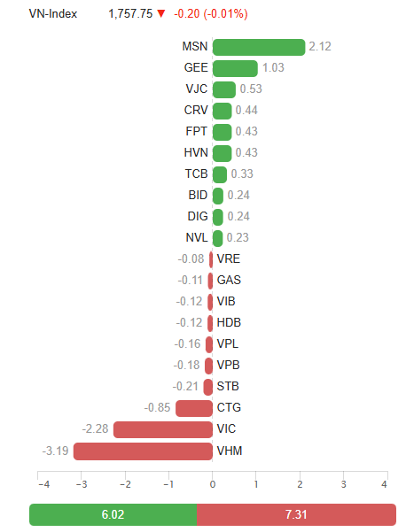 Trong top 10 cổ phiếu tác động tiêu cực nhất lên VN-Index, dẫn đầu là VHM lấy đi 3.19 điểm, VIC 2.28 điểm, CTG 0.85 điểm và STB 0.21 điểm.