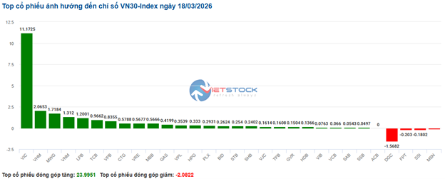 Các mã cổ phiếu trong rổ VN30 hầu hết đều tăng và lực mua có phần áp đảo. Cụ thể, VIC, VHM, MWG và VNM lần lượt đóng góp 11.17 điểm, 2.06 điểm, 1.71 điểm và 1.31 điểm vào chỉ số chung. Trái lại, DGC, FPT, SSI và MSN đang gặp phải áp lực bán và lấy đi hơn 2 điểm từ VN30-Index.