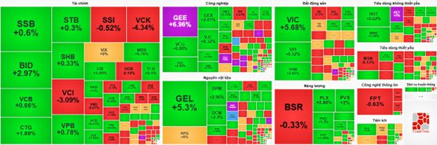 Theo sau đó là cổ phiếu ngành tài chính cũng lan tỏa sắc xanh với các ông lớn như BID tăng 3.21%, CTG tăng 1.89%, VCB tăng 0.83%, STB tăng 0.3% và SHB tăng 0.33%. Trái lại, vẫn có một số cổ phiếu vẫn đang chịu áp lực bán như VCK giảm 4.34%, VCI giảm 3.36%, VND giảm 0.91%...