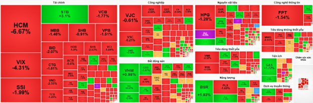 Ngành tài chính đáng chú ý khi áp lực bán diện rộng ở các mã cổ phiếu. Cụ thể, HCM giảm 4.71%, VIX giảm 2.15%, TCB giảm 0.56% và SHB giảm 1.21%...