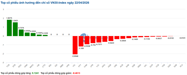 Các cổ phiếu trong rổ VN30 tăng giảm đan xen nhưng lực bán có phần lấn lướt hơn. Cụ thể, VIC, FPT, VHM, LPB lần lượt lấy đi 2.05 điểm, 1.18 điểm, 0.93 điểm và 0.79 điểm vào chỉ số chung. Trái lại, TCB, STB, DGC, VNM tiếp tục nâng đỡ chỉ số và góp vào hơn 4.5 điểm.