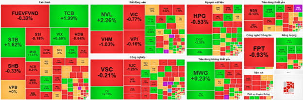 Sắc xanh đỏ cũng đan xen trong rổ VN30 với 13 mã giảm,11 mã tăng và 6 mã đứng giá. Trong đó, VIC, VHM, VJC, FPT là những cổ phiếu giảm điểm mạnh nhất. Ở chiều ngược lại, TCB, STB, DGC, VPB là những cổ phiếu tăng giá mạnh nhất.