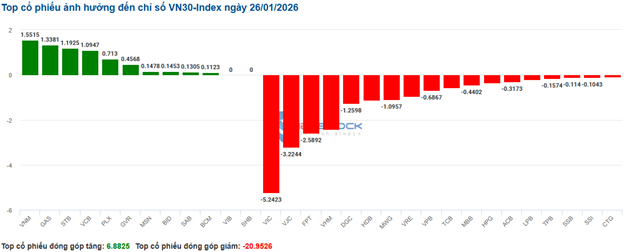 | Top 10 cổ phiếu tác động mạnh tới VN-Index phiên sáng 26/01/2025 (tính theo điểm) | ||