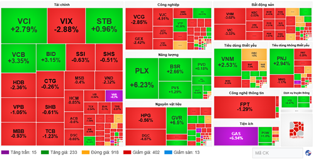 Sắc xanh đỏ đan xen ở các nhóm ngành, trong đó một số mã cổ phiếu đầu ngành năng lượng tăng tích cực từ đầu phiên như PLX tăng 3.85%, BSR tăng 1.21%, PVS tăng 1.29% và PVD tăng 1.63%.