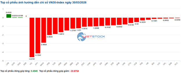 Các mã cổ phiếu ngành ngân hàng như VIC, FPT, MWG và VPB đang tác động tiêu cực đến VN30-Index khi lần lượt lấy đi 4.57 điểm, 4.13 điểm, 2.9 điểm và 2 điểm từ chỉ số chung. Trái lại, LPB, GVR và GAS là ba cổ phiếu trụ cột tuy vẫn giữ được sắc xanh nhưng tác động tích cực không đáng kể đến VN30-Index.