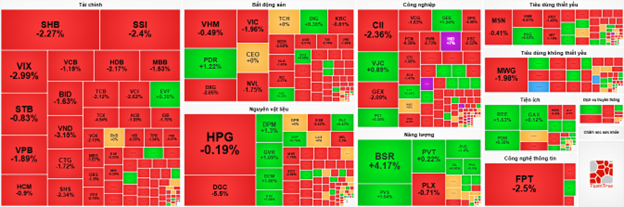 Sắc đỏ có phần áp đảo ở các nhóm ngành. Trong đó, ngành tài chính tiếp tục gặp nhiều “sóng gió” khi hầu hết các mã đều ghi nhận sắc đỏ. Cụ thể, SSI giảm 2.77%, SHB giảm 2.27%, VIX giảm 3.28% và STB giảm 1.34%, HDB giảm 2.57%, MBB giảm 1.53%...