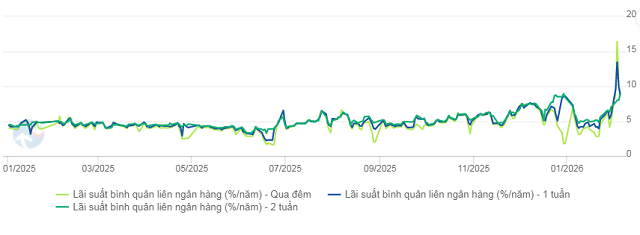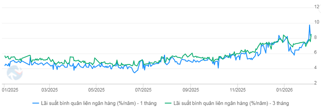 Tuần qua, lãi suất liên ngân hàng tăng vọt trên hầu hết các kỳ hạn, đặc biệt biến động mạnh trong những phiên đầu tuần. Cụ thể, lãi suất qua đêm tăng 351 điểm cơ bản so với cuối tuần trước, lên mức 8.6%, sau khi có thời điểm vọt lên trên 17.25% trong phiên 03/02, trước khi hạ nhiệt dần về cuối tuần. Các kỳ hạn 1 tuần và 2 tuần cũng tăng lần lượt 296 và 191 điểm cơ bản, lên mức 8.85% và 8.9%.